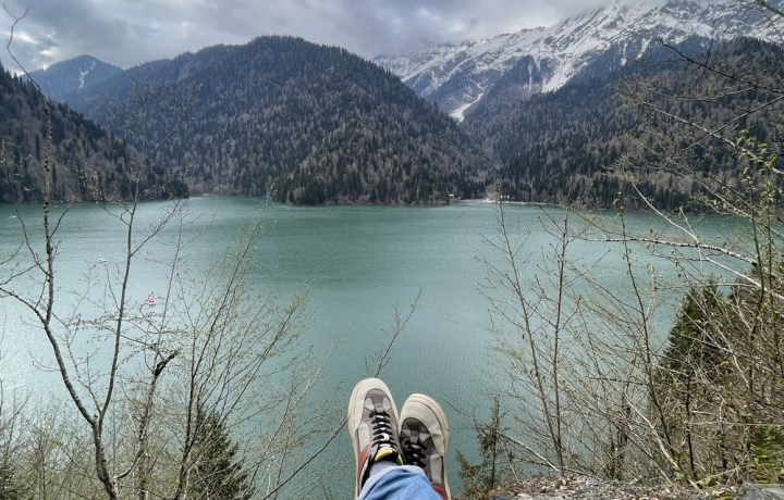 - Озеро Рица — финальная точка маршрута. Оно расположено на высоте 950 метров над уровнем моря среди хвойных лесов и скал. Воздух здесь пахнет сосной, тишиной и вечностью