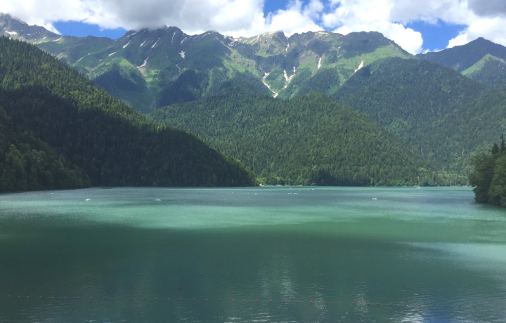 Озеро Рица — и наконец окажемся у безмятежного озера, окружённого горными пиками Абхазии.