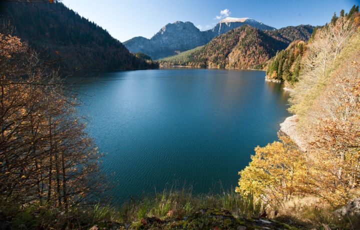 Озеро Рица — природное сокровище Абхазии. В чистой прозрачной воде видны рыбы и водоросли, вокруг раскинулся реликтовый парк, высятся заснеженные горные вершины.
