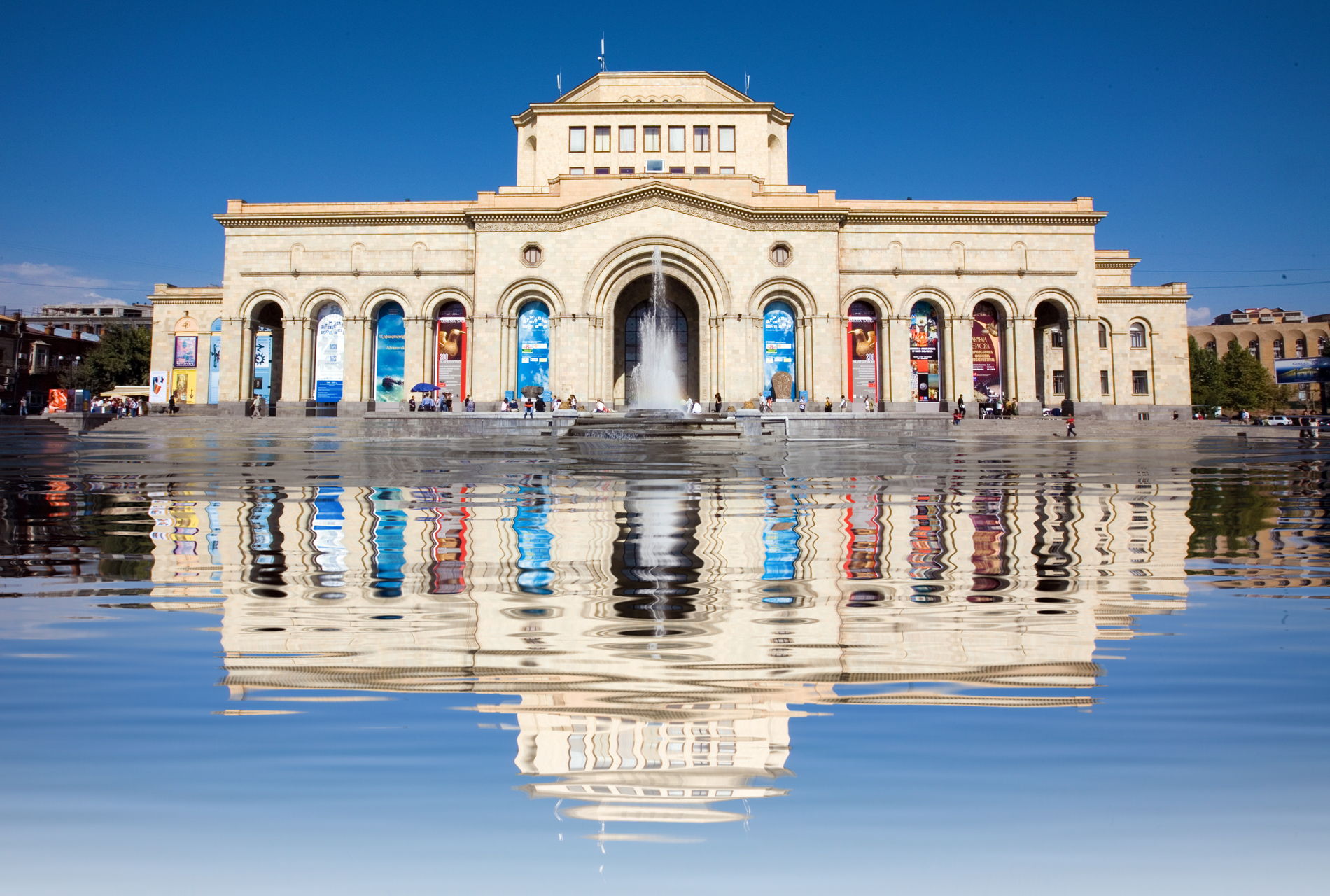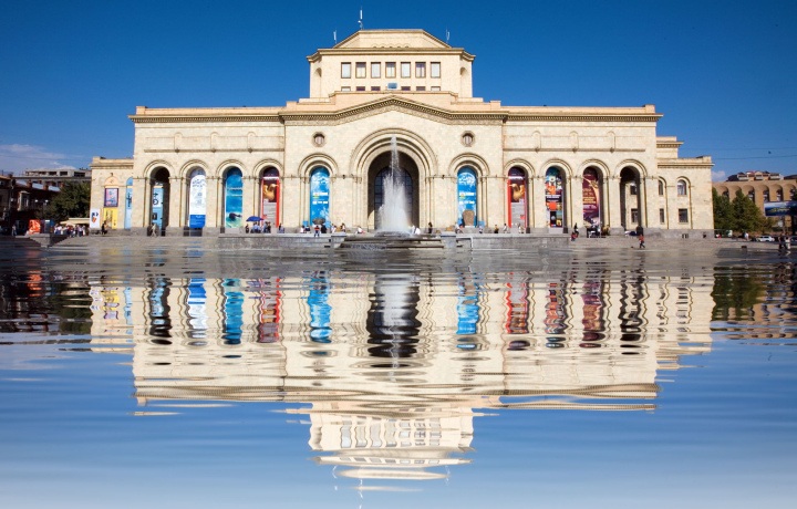 Конечный пункт нашей пешей прогулки — Площадь Республики. Это центральная площадь армянской столицы, построенная по проекту А. Таманяна в середине XX века.