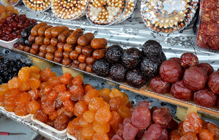 Мы не просто гуляем по восточному базару, а дегустируем потрясающие местные сладости: необычную халву из кунжута, нежную хурму, сладкую колбасу из фундука и шелковицы, орехи со вкусом шоколада. Каждая сладость — эксперимент с взрывным вкусом.