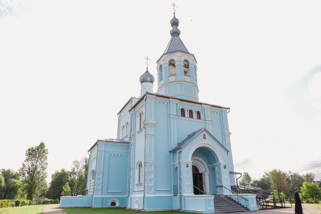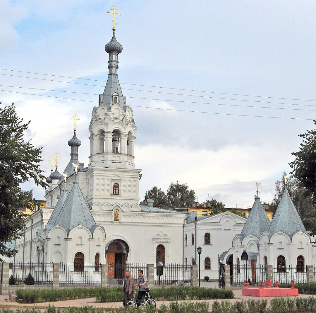 Изящный белокаменный архитектурный ансамбль замыкает перспективу Минской улицы. В центре над притвором высится 3-ярусная колокольня. Длинное прямоугольное здание на востоке завершается четвериком, увенчанным пятиглавием. По обеим сторонам от храма симметрично стоят четыре часовни под шатровыми куполами. Несмотря на внешнюю отделку, выдержанную в псевдорусском стиле, храм больше напоминает католическую базилику. Внутреннее пространство разделено колоннами на три нефа. Интерьер украшают аналои, иконостас, резные киоты с образами. На выбеленных стенах — иконы работы московских мастеров, иконописцев Оптиной пустыни и минского Елизаветинского монастыря.
