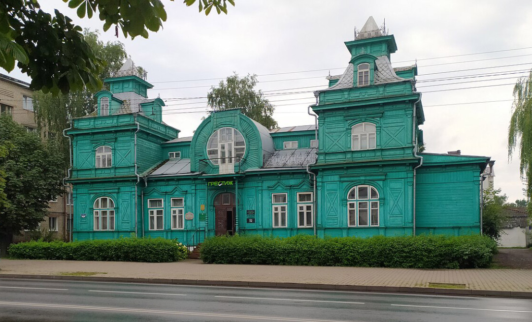 Деревянный особняк в стиле модерн украшает улицу Интернациональную (бывшую Присутственную). Он принадлежал купчихе 1-й гильдии Пае-Брайне Кацнельсон, сделавшей состояние на торговле лесом. Поговаривают, что в 1912 году дом был куплен в Прибалтике, разобран и доставлен в Бобруйск. Но это лишь одна из версий появления в городе роскошного особняка зелёного цвета с двумя мезонинами в виде симметричных шатровых башен, круглой мансардой и балкончиком. Через несколько лет жившая в Петербурге купчиха сдала свой дом в аренду полицейскому участку. После революции в особняке некоторое время размещался ревком, а потом его передали городской библиотеке, которая занимала историческое здание до 2014 года. Сейчас дом находится в аварийном состоянии и пустует.