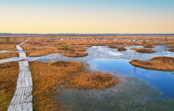 На территории болотного массива проложено несколько маршрутов. Если планируете просто погулять, без походной экипировки и непромокаемой обуви, будем ходить по обустроенным тропам и деревянным настилам. А если возьмёте с собой резиновые сапоги, то сможете: