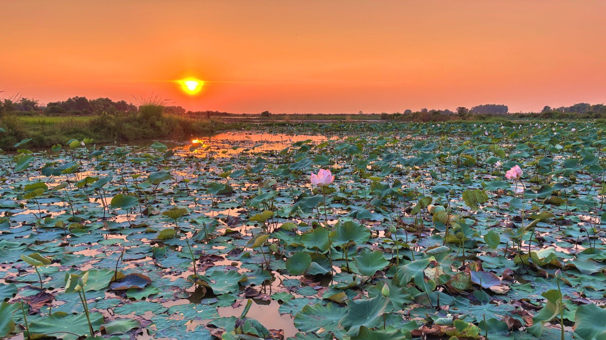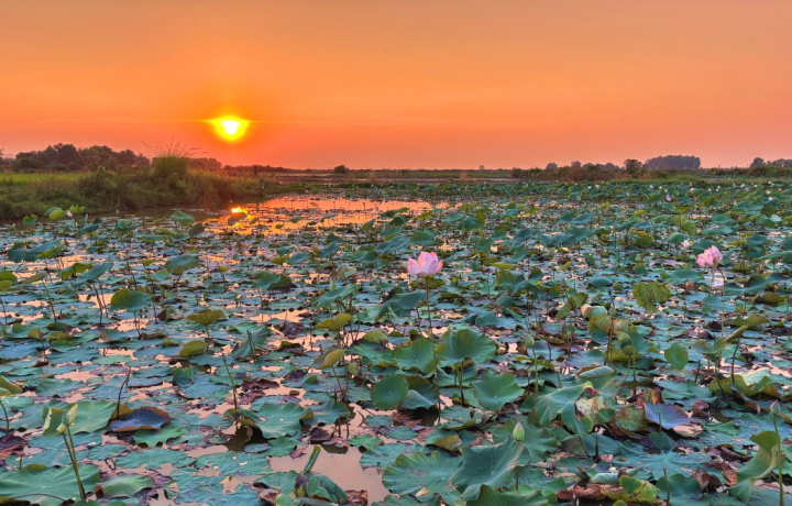 Встретим закат среди лотосовых и рисовых полей.
