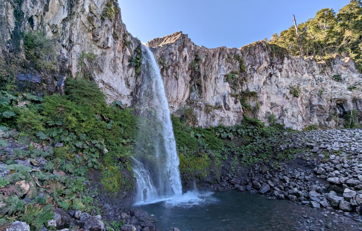 Совершим лёгкую прогулку по тропе длиной менее километра через зелёный лес, и перед нами откроется 20-метровый водопад. Это место, где встречаются антарктический лес и лавовые поля, образованные после древних извержений. Здесь можно сделать отличные фотографии и освежиться в прохладных водах.