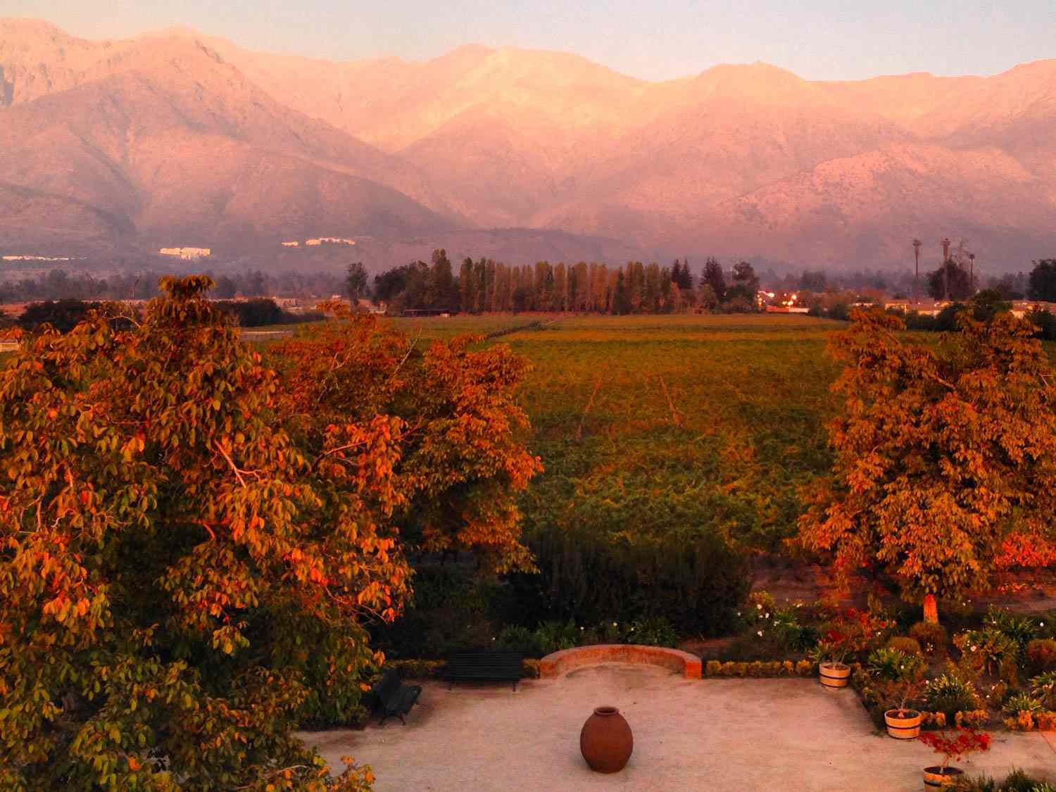 Широкие виноградники, где растут сорта Cabernet Sauvignon, Carménère и Merlot.