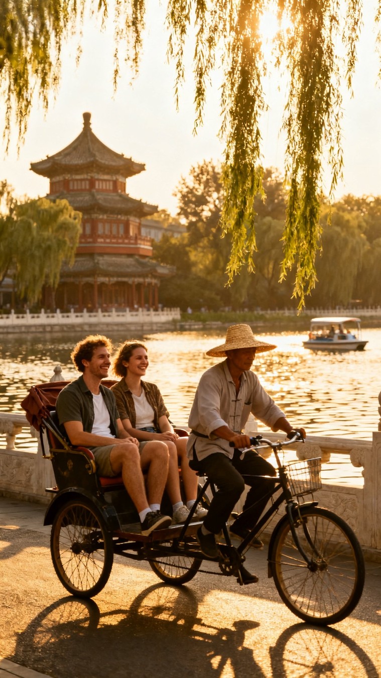 9:00–10:00 — прогулка на рикше по старинным переулкам. Вы проедете мимо серых стен сыхэюаней, пройдёте вдоль озёр и храмов, услышите, как Пекин просыпается — неторопливо, с ароматом утреннего чая и звоном велосипедных звонков