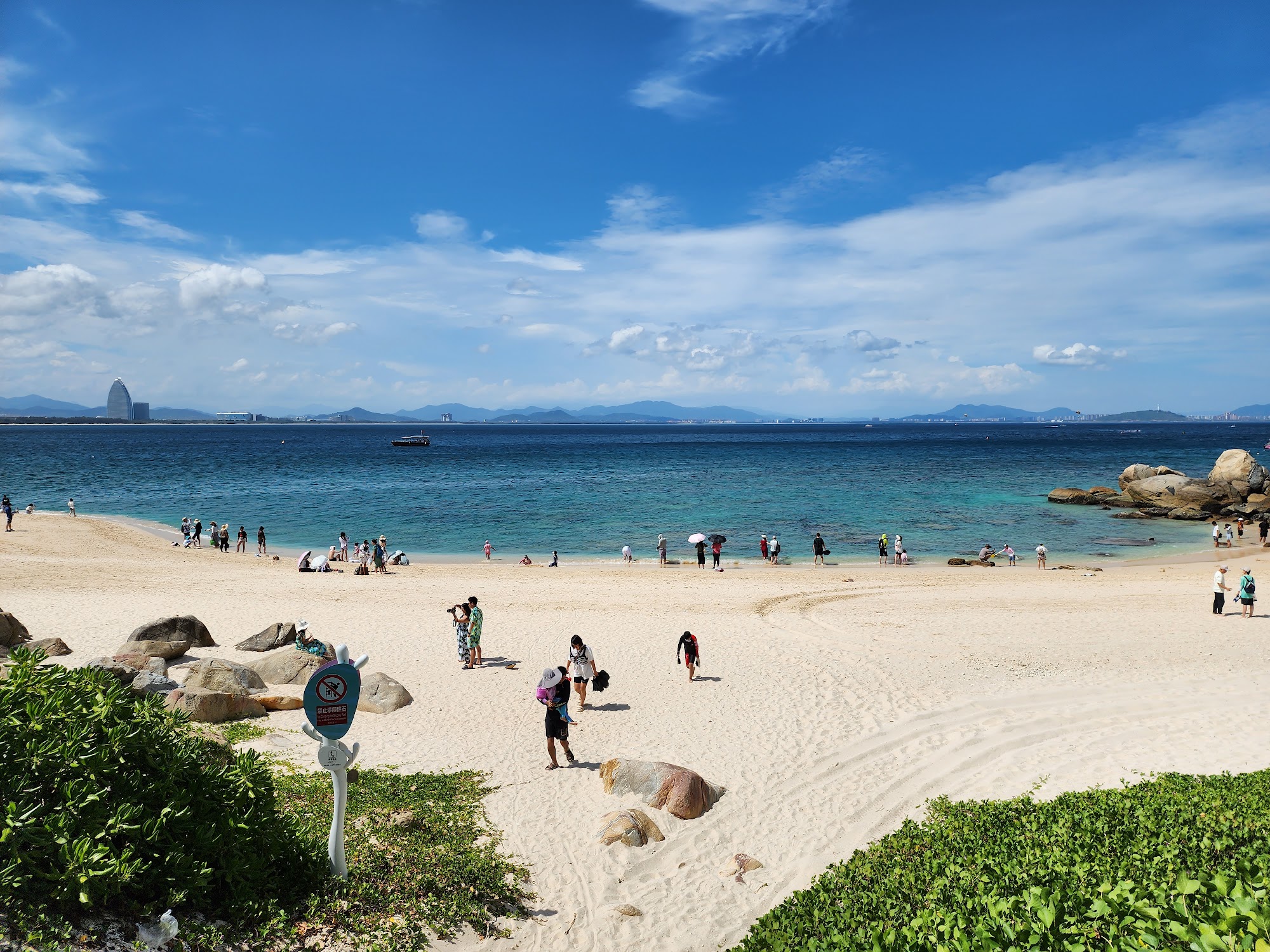 Залив Санья известен благоустроенными пляжами, элитными отелями и хорошим шопингом. Здесь нет шумных молодёжных вечеринок, курортные комплексы в районе Sanya Bay рассчитаны преимущественно на приверженцев спокойного семейного отдыха. Городской пляж Саньи привлекает отдыхающих чистым плотным песком, пологим входом в воду и спокойным морем без больших волн. Ещё один плюс — прекрасный вид на небоскрёбы острова Феникс.