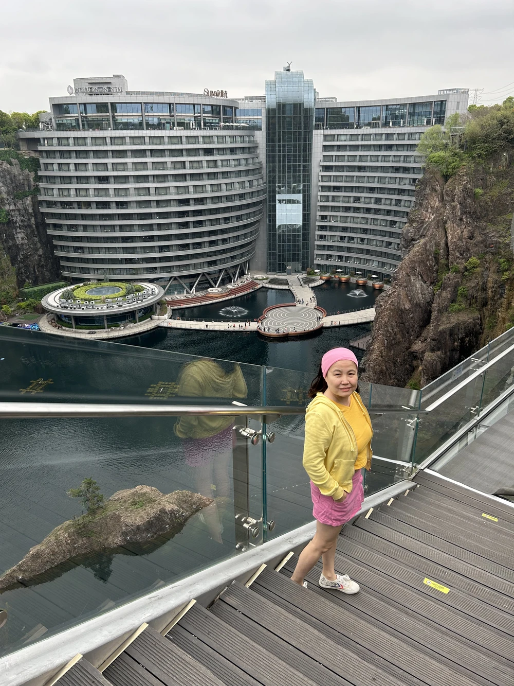 Вы увидите отель, встроенный в бывший карьер почти стометровой глубины. Даже без заселения сюда имеет смысл приехать: можно спуститься к обзорной площадке, посмотреть на водопад, зайти в лобби или кафе и пофотографировать фасад, уходящий вниз, а не вверх.