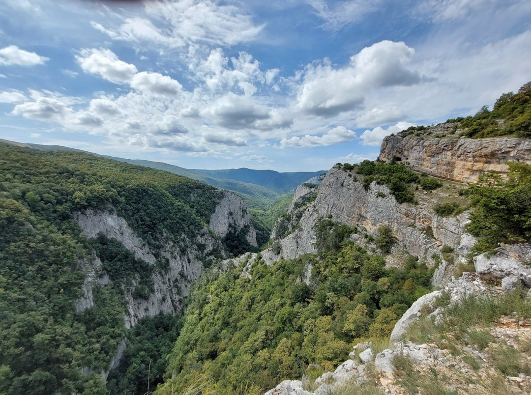 Большой каньон Крыма протянулся на 3,5 км вдоль Ай-Петринской яйлы недалеко от села Соколиное. Разлом глубиной около 320 м образовался 2 миллиона лет назад в результате тектонической активности. По дну протекает река Аузун-Узень, которую питают мелкие речушки и подземные источники. Нижние пласты каньона сложены из плотных песчаников, верхние известняковые сформировались из спрессованных остатков доисторических морских обитателей. От постоянного воздействия воды и движения земной коры на дне образовались крупные пороги с небольшими водопадами и природные ванны. Голубое озеро, источник Пания с Ванной Трезвости, Ванна Молодости и Яблоневый брод — главные местные достопримечательности.