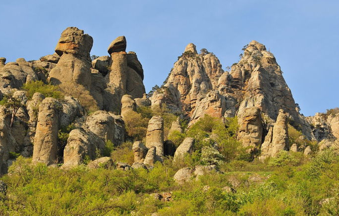 Сколько часов имеет день, столько раз меняется ее цвет»: так говорит легенда о горе Демерджи, где раскинулась Долина Привидений с причудливыми каменными изваяниями. А в одном из живописнейших урочищ шумит и завораживает взор самый полноводный водопад Крыма — Джур-Джур, пенные струи которого, разбиваясь у подножия уступа, образуют в ледяной пыли играющую радугу.