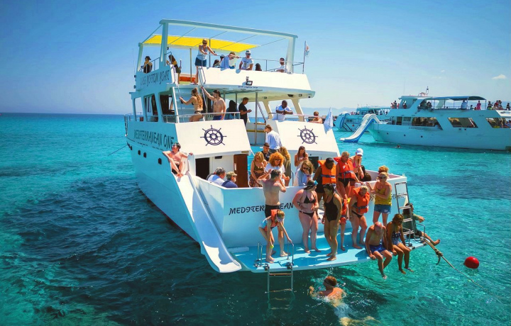 Искупайтесь в прозрачных водах, насладитесь солнцем и морским бризом, скатитесь с водной горки или просто отдохните в тени на палубе корабля. В это время капитан угостит вас комплиментом — бокалом кипрского вина, свежими сезонными фруктами и соком.