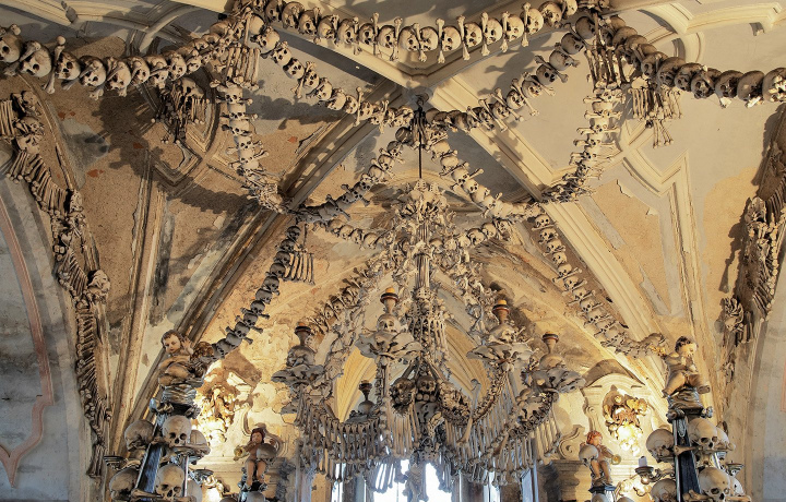 Но в Седлеце, в предместье города, Вы встретите то, зачем люди со всего мира приезжают сюда. Часовня готического собора, интерьер которой полностью выполнен из человеческих костей. История часовни началась, когда один монах привез немного земли из Иерусалима и таким образом освятил кладбище. С тех пор захоронения здесь стали очень популярны, а эпидемия чумы и гуситские войны значительно прибавляли количество смертей. На кладбище просто не хватало места для новых погребений, и кости начали складывать в усыпальнице. Потом же, из собранных там костей резчик по дереву оформил интерьер часовни – с огромной люстрой, где хоть один раз, но встречается любая кость человека, или, например, со своей подписью, выполненной из того же материала. Мы приглашаем и Вас погрузиться в мистическую атмосферу этого места!