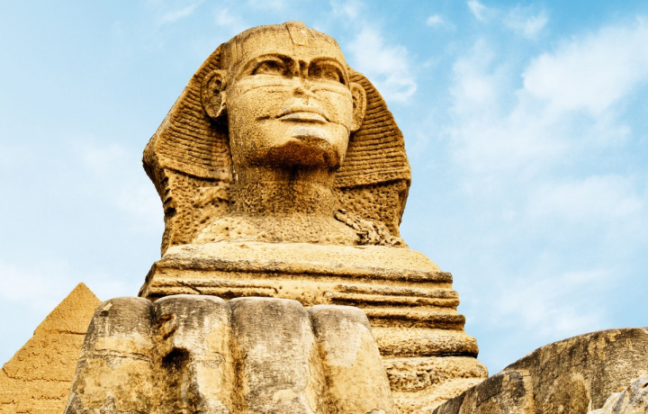 Древний и загадочный Большой Сфинкс соединил в себе черты нескольких существ. У него голова женщины, тело и лапы льва, хвост быка и крылья орла. Вытесанная из известнякового монолита мифическая фигура стоит перед пирамидой Хефрена в долине Гизы. Высота колосса — 20 метров, длина тела — 73 метра.