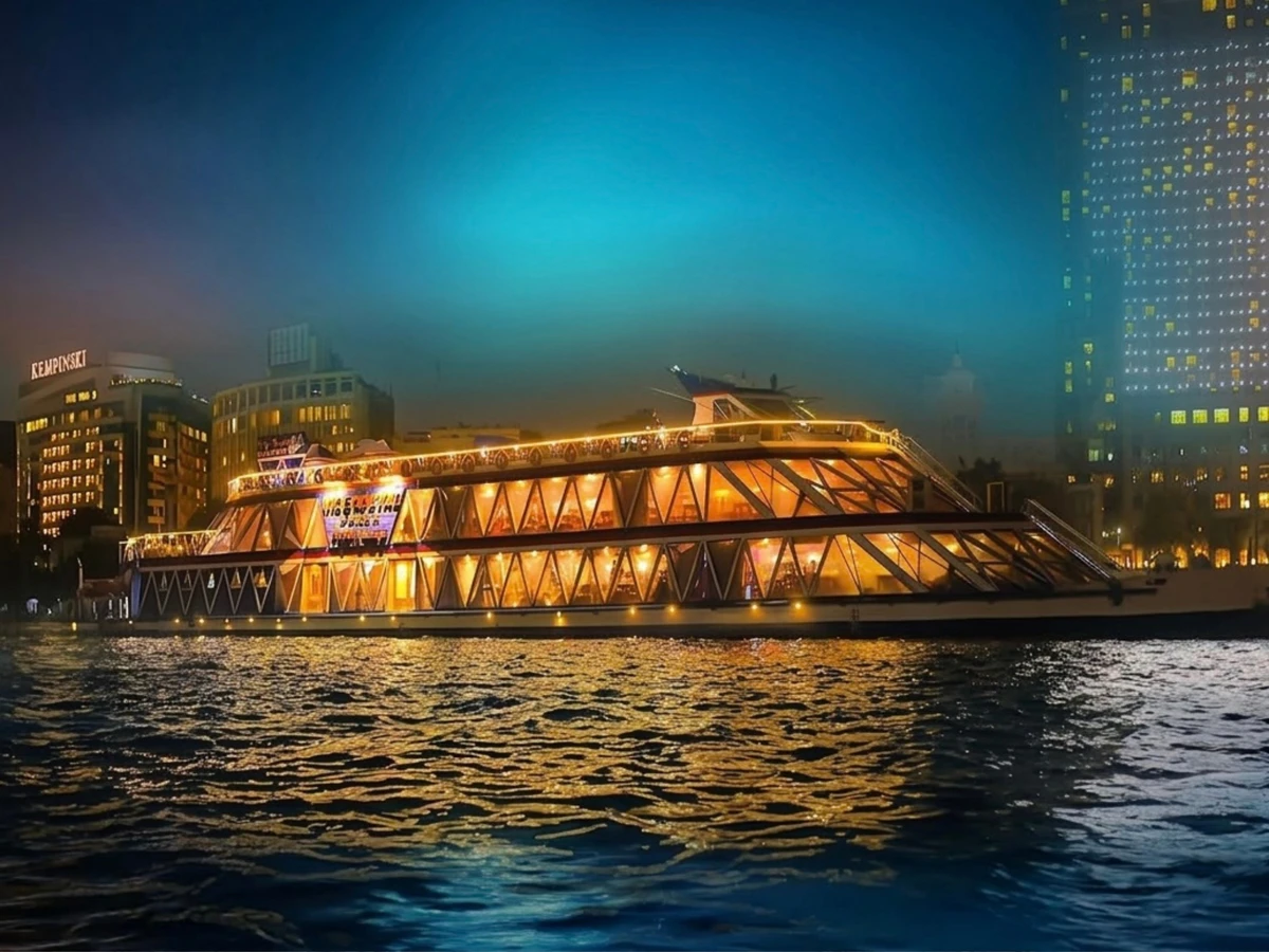 После прогулки вы отправитесь к причалу. Во время круиза вас ждёт ужин в формате «шведский стол», живая музыка, танура (танец с юбками), восточное танцевальное шоу и виды на Каир, залитый огнями.