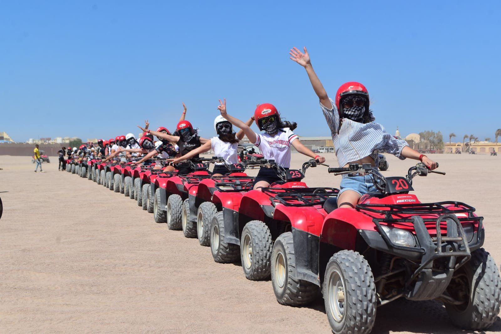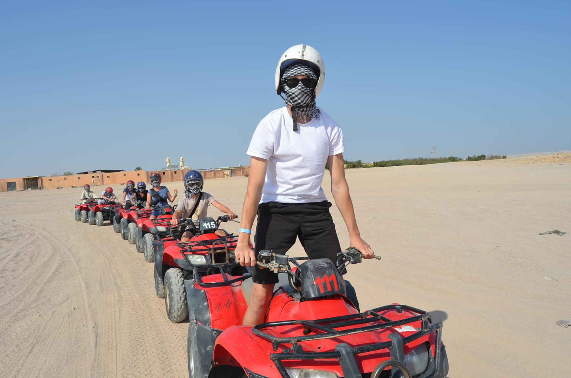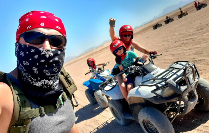 Всего 20 минут от Хургады — и мы в сказочно красивой Аравийской пустыне. На базе наш квалифицированный инструктор покажет, как управлять квадроциклом. Это совсем не сложно и не требует навыков вождения. И вот 45 минут едете по пустыне, наслаждаясь окружающими фантастическими пейзажами. Около часа остановимся в деревне бедуинов, где вы сможете отдохнуть, прокатиться на верблюде, сделать красивые фото, попробовать бедуинский чай и местный хлеб, который здесь же и изготавливается.