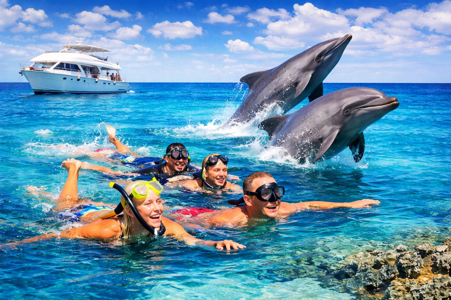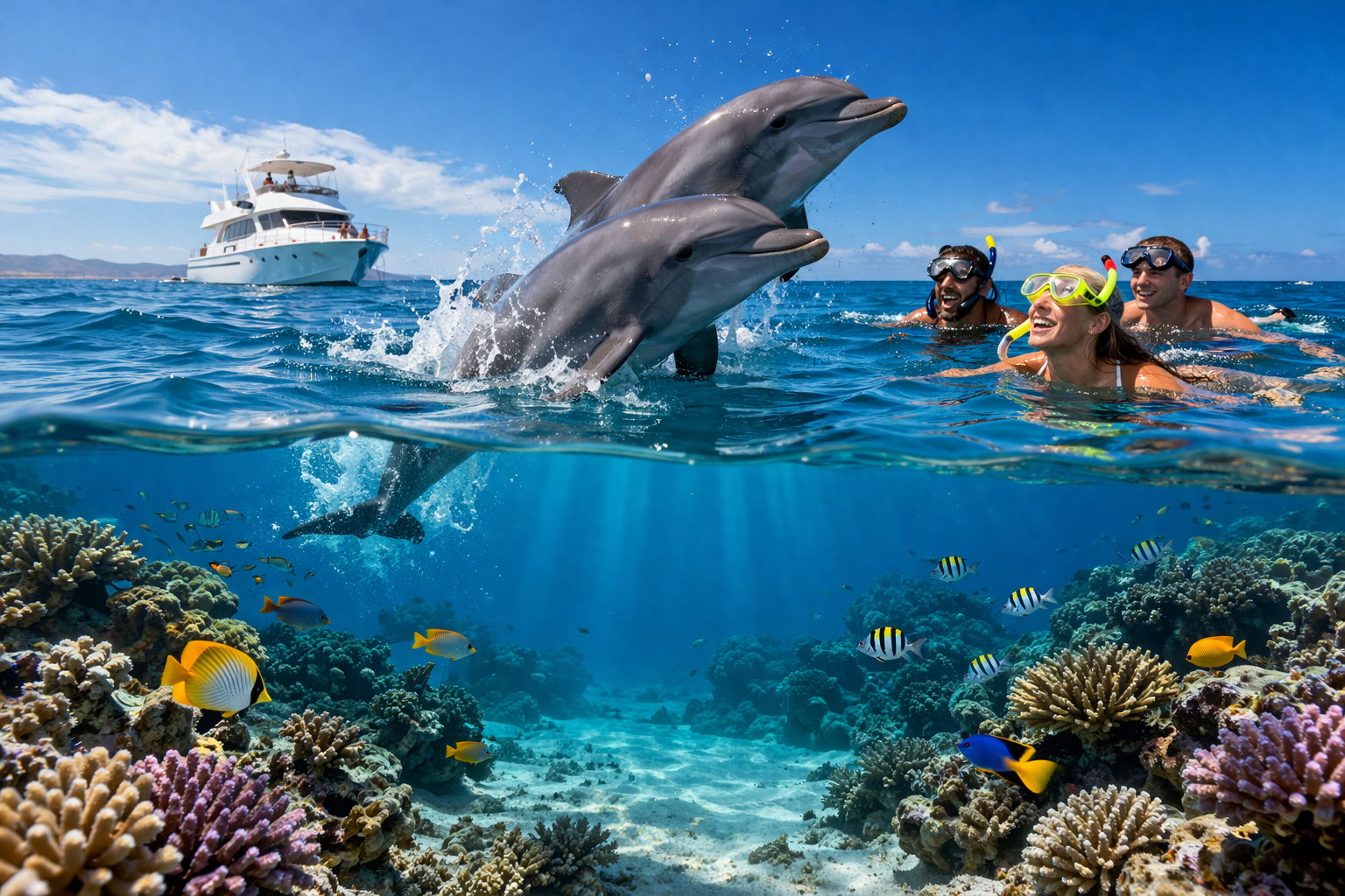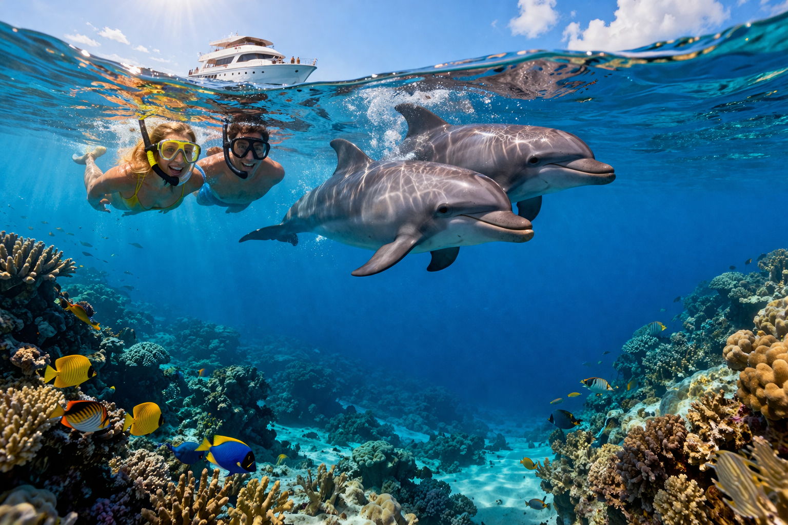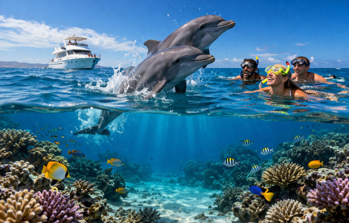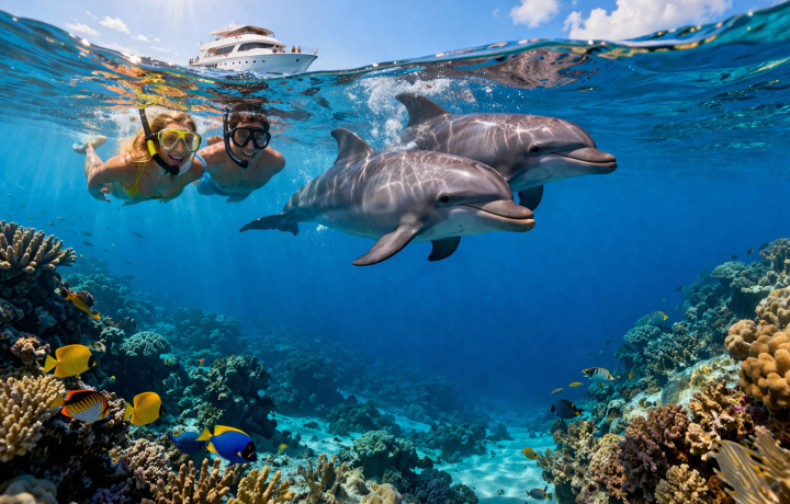 Присоединяйтесь к увлекательной экскурсии на яхте в Хургаде, где вас ждёт плавание с дельфинами и снорклинг на красивых коралловых рифах! Вы сможете насладиться уникальной возможностью поплавать рядом с дельфинами и увидеть яркий подводный мир Красного моря. На борту вас ожидает вкусный обед и время для отдыха на солнце.
