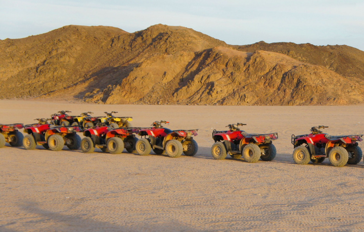 Отличное развлечение недалеко от курорта, из отеля привозят на сафари-станцию, откуда уже едете на джипе к бедуинам, по дороге гид группы Марина рассказывала много интересного, можно сфотографироваться с верблюдами, затем на джипах опять возвращаемся на станцию, если нужно дают бутылку воды на каждого, и отправляетесь уже кататься на квадроциклах, туда-обратно примерно полчаса занимает, но далеко в пустыню не выезжают, для этого можно взять тур только на квадроциклах. Еще были багги, но квадроциклы интереснее. В обед вы уже в отеле, и действительно экскурсию лучше брать на утро, пока не так жарко.