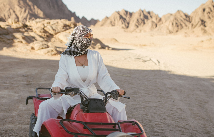 Это шикарная поездка! Утро, 4 утра, нет жары как раз, сумеречно, очень захватывающе! Арафатка, очки, вода, удобная одежда и в путь! Инструктаж проведуи, арафатку завяжут, шлем наденут и погнали! Путь по пустыне захватывает! Мы до этого катались в Турции и в Калужской области, здесь все иначе. Песок, барханы, колючки, непривычные деревья, верблюды, бедуины и их жилье — не забываемо! Возьмите мелкие купюры, чтобы вознаградить за чай мальчиков-бедуинов (сдачи у них не будет).