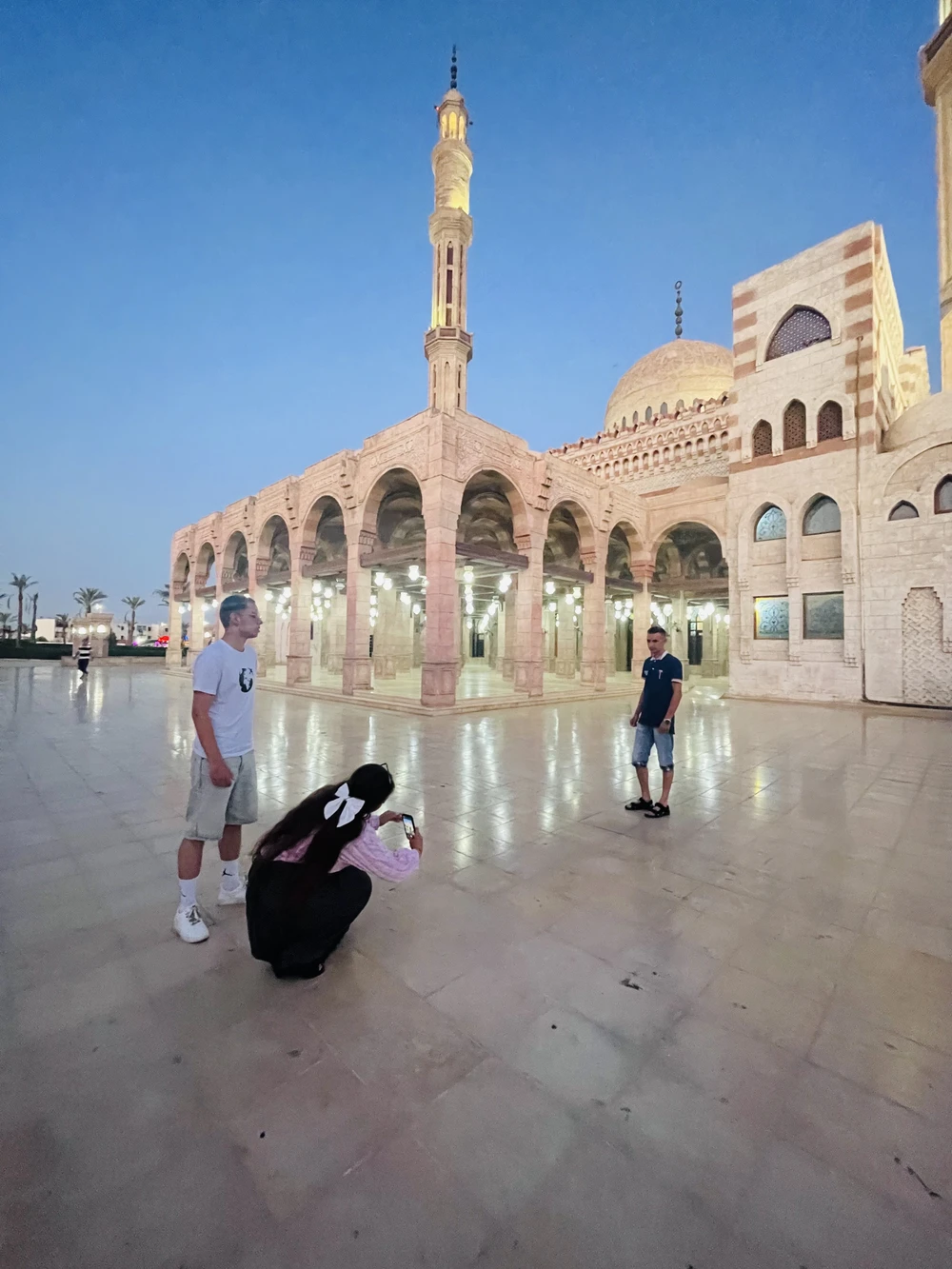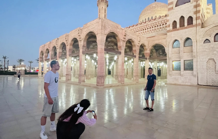Вы окажетесь в шумной атмосфере восточного рынка. Здесь можно торговаться, попробовать арабские сладости, рассмотреть лавки со специями, маслами и экзотическими фруктами. И конечно, прикупить необычные сувениры. Рядом возвышается мечеть Эль-Сахаба — если захотите, заглянем и внутрь.