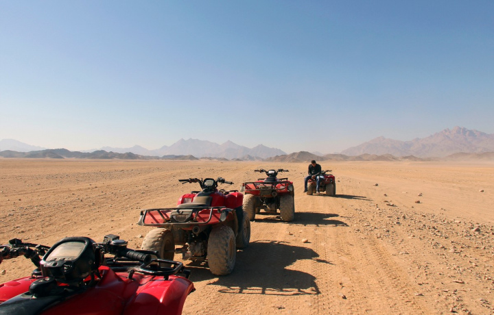Всего 30 минут от Шарм-эль-Шейха — и мы в сказочно красивой Синайской пустыне. На месте наш квалифицированный инструктор покажет, как управлять квадроциклом. Это совсем не сложно и не требует навыков вождения. И вот вы уже едете по пустыне, наслаждаясь окружающими фантастическими пейзажами! В конце мы обязательно заглянем в колоритную деревню: попьем чай и познакомимся с бедуинами.