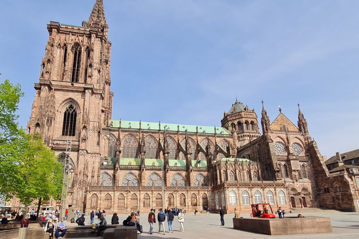 Возведение Кафедрального собора Нотр-Дам в Страсбурге длилось почти 300 лет, начиная с 1015 года. В результате в городе вырос величественный готический храм из красного вогезского песчаника с резным фасадом. Столь долгое строительство сказалось на архитектуре здания. Восточный портал и хор выполнены в романском стиле. Многофигурный западный фасад и продольный неф — шедевр средневековой готики.