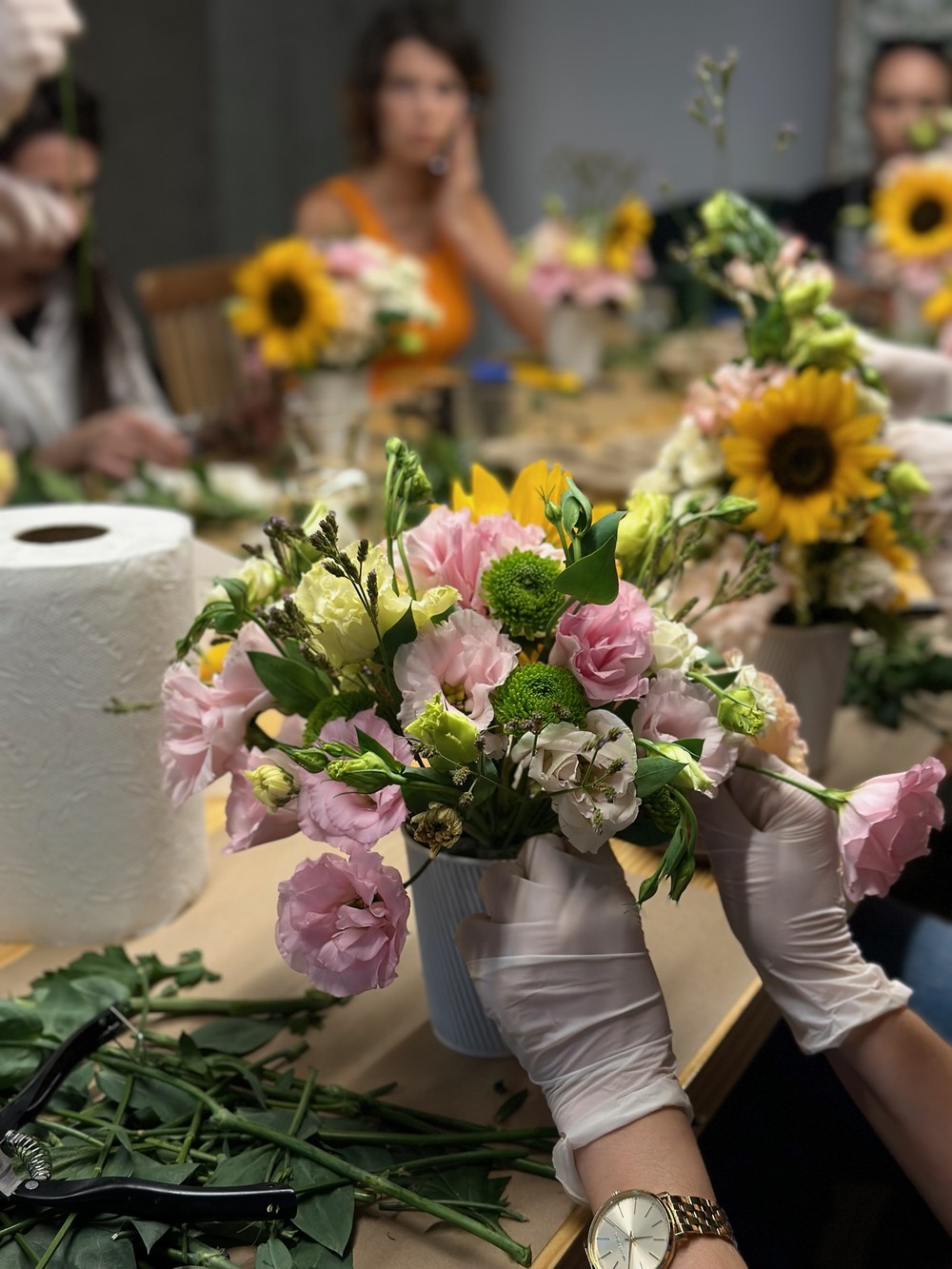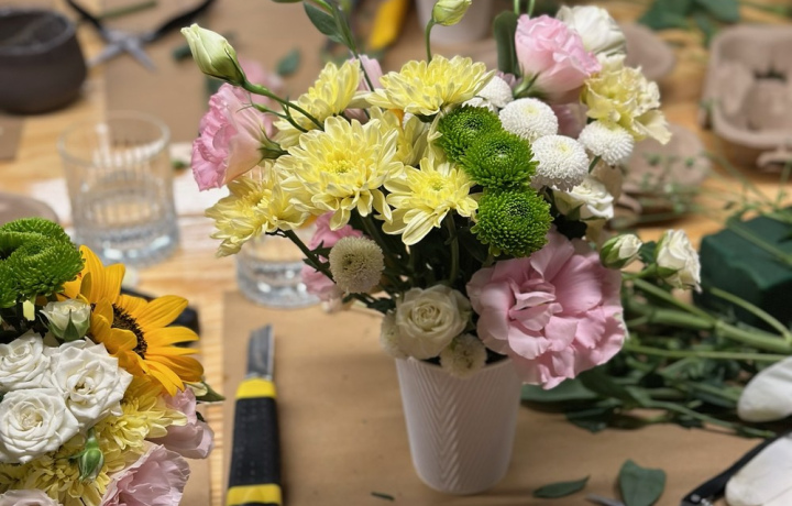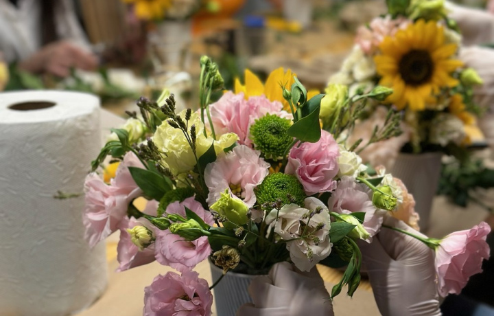 Мы будем работать с живыми сезонными цветами: каждый участник создаст свою композицию — в букете или в мини-корзине (на выбор). Готовую работу вы заберёте с собой!