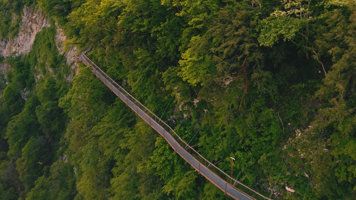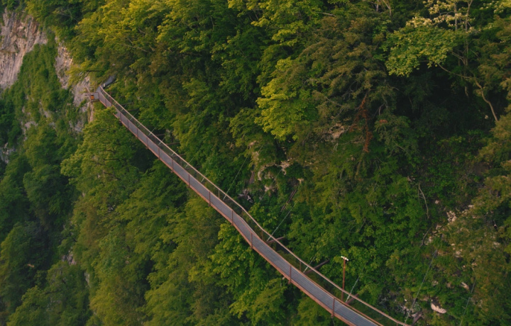 Прогулка по знаменитой подвесной тропе длиной около 780 метров, расположенной прямо над ущельем. С обзорной площадки открываются панорамы каньона. Пеший маршрут проходит через исторический лес Дадиани и занимает около 2–3 часов.