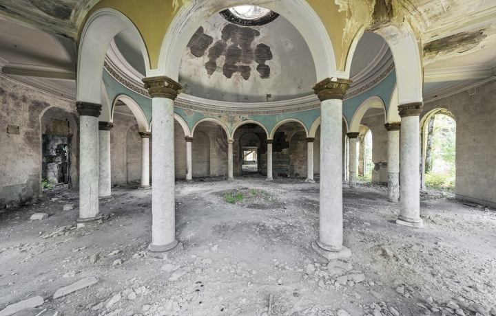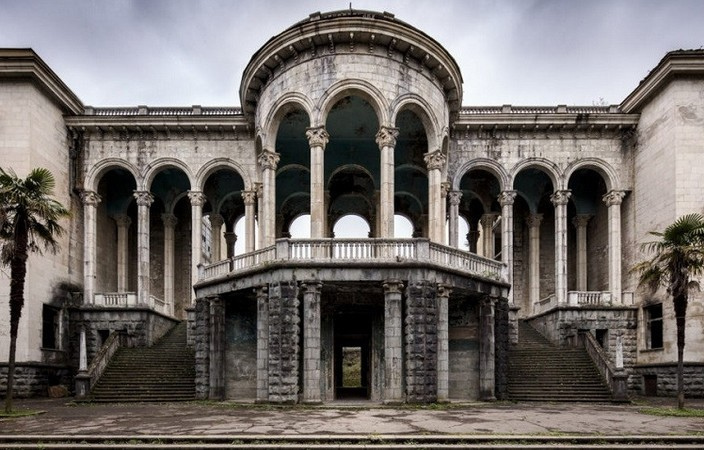 Сейчас большинство санаториев находится в руинированном состоянии, поэтому у нас есть возможность увидеть многие архитектурные детали без ретуши. Мы пройдем по некоторым из комплексов и представим, каким он был — день советского курортника в Цхалтубо.