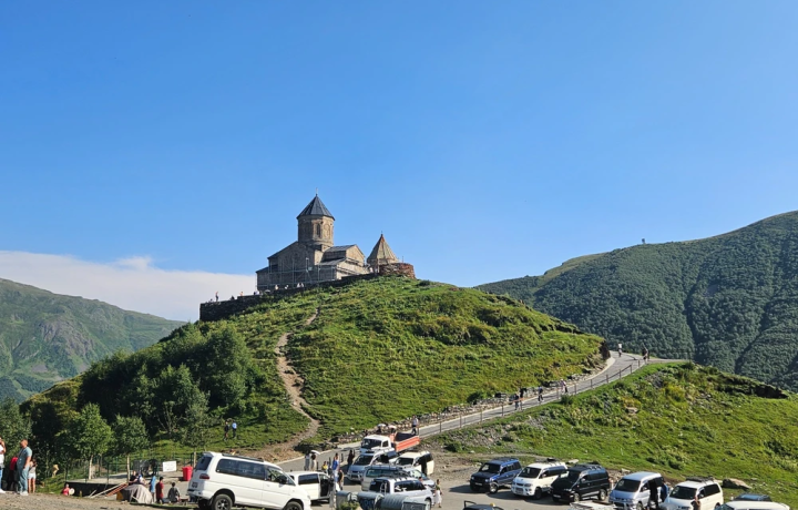 Троицкая церковь в Казбеги (45 мин). Отсюда вы взглянете на его величество Казбек — одну из самых знаменитых вершин Кавказа. Гид расскажет об истории храма и покажет зал, где местные старейшины вершили закон и решали насущные вопросы региона.