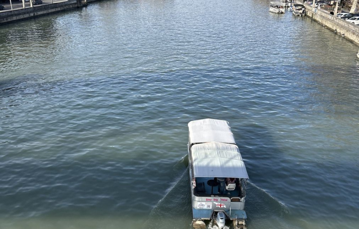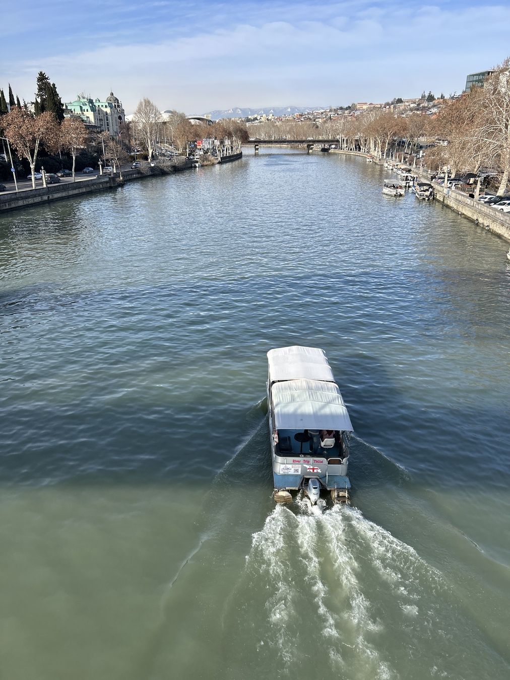 Наше путешествие начнётся с катера по реке Кура. С воды город выглядит иначе — мягче, масштабнее, кинематографичнее.