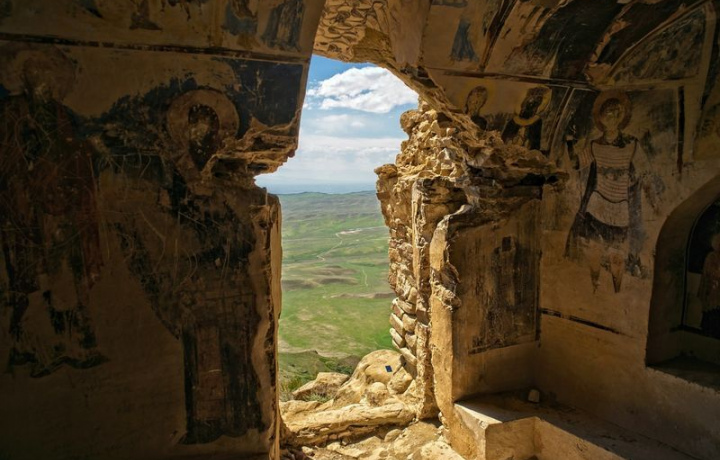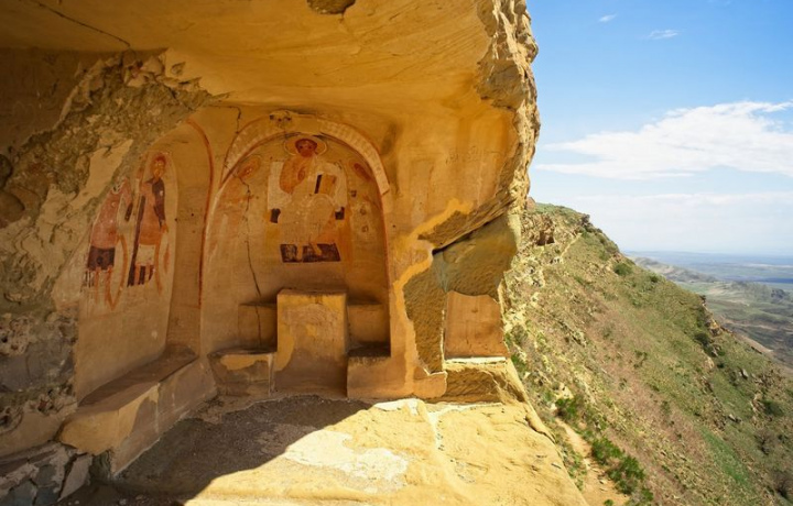 Трекинг и живописные виды окрестностей. Дальше вас ждет двухчасовой поход на хребет, являющийся границей двух стран. Вы сможете прогуляться по противоположному склону. Во время похода осмотрите высеченные в скале помещения древнего монастыря Тетри-Удабно. Фрагментарно сохранившиеся настенные росписи — интересный образец грузинской средневековой живописи. Также вы окинете взглядом открывающиеся сверху виды соседнего Азербайджана.