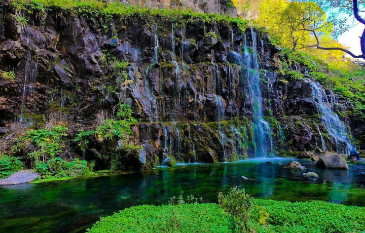 Спустившись вниз, вы почувствуете лёгкий бриз, от речек которые протекают там, а также от водопадов которые незаметно для всех как косы девушки опускаются с вершины обрывистого каньона.
