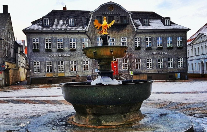 Наша экскурсия по городу, который полностью внесен в список Всемирного наследия ЮНЕСКО, начнется с прогулки по его главной площади — Рыночной. Здесь мы увидим городскую ратушу Гослара, построенную в готическом стиле, здание купеческой гильдии, а также главную гордость города — старейший и самый большой средневековый фонтан Германии. Украшает фонтан скульптура золотого орла — это символ города, а также эмблема императора и его империи. А затем увидим самую старую аптеку Гослара, основанную в 1780 году и работающую по сей день.