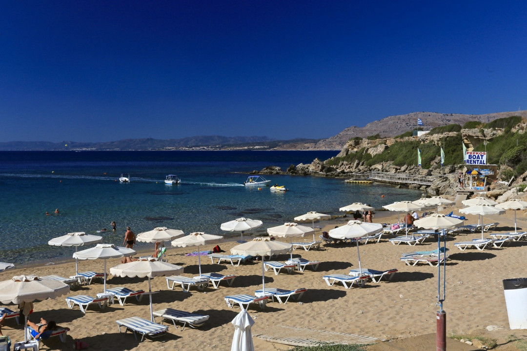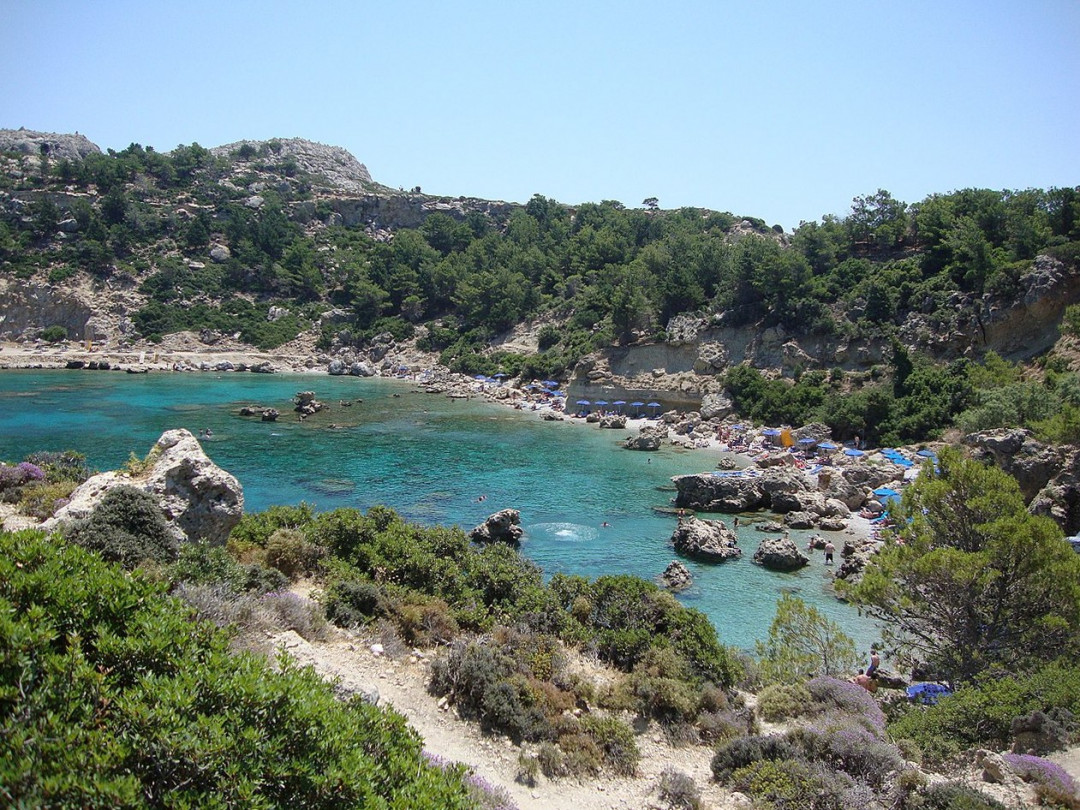 Окаймлённая скалами бухта Энтони Куинна на северо-востоке Родоса — одна из самых красивых на острове. Имя знаменитого голливудского актёра бухта получила в 1966 году после того как её пейзажи появились в эпизодах культового фильма «Грек Зорба». Именно здесь Куинн впервые исполнил танец собственного изобретения, который назвали «сиртаки». Скалы защищают акваторию от ветра и волн, чистые прозрачные воды бухты идеальны для дайвинга и снорклинга. На небольшом песчано-галечном пляже есть всё необходимое для комфортного отдыха — зонты с шезлонгами, понтон для спуска в воду, прокат лодок и катамаранов, собственный дайвинг-центр. На площадке над пляжем работает кафе.