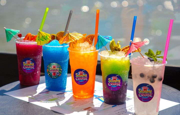 Отправляясь от причала №11, ваше путешествие начинается с прохладного напитка в руке и лёгкого летнего ветерка. Выбирайте из ярких вкусов слаши, таких как клубника, голубая малина, радуга.