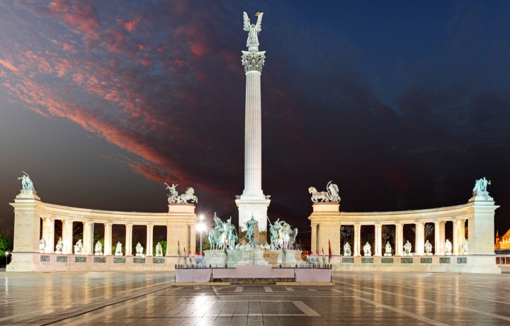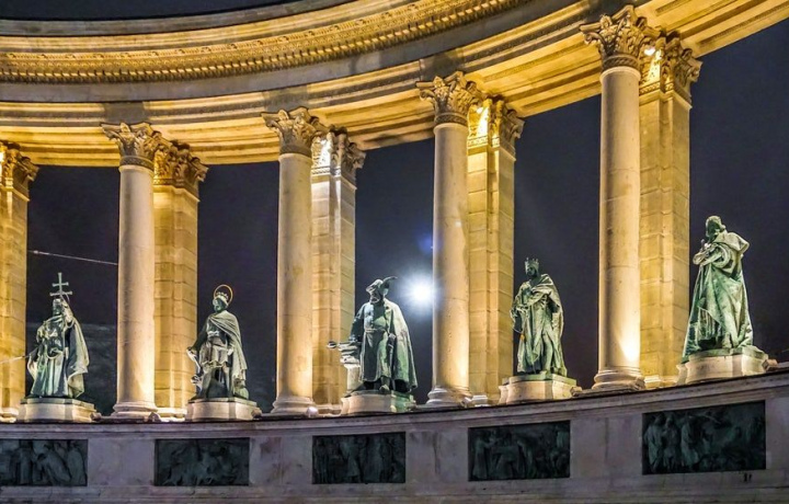 Начнем наше путешествие с площади Героев, величественного символа венгерской истории. В ночной подсветке она выглядит особенно монументально и торжественно. Огни подчеркивают каждую деталь этого архитектурного ансамбля, создавая атмосферу величия и героизма.