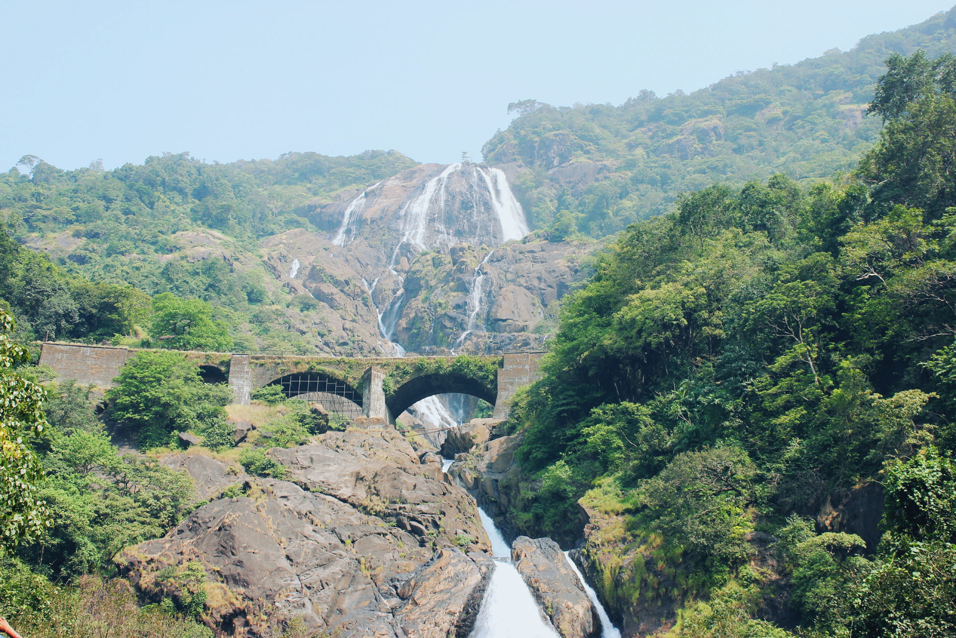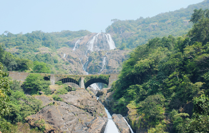 Белые каскады Дудхсагара низвергаются с уступов среди густых джунглей, а рядом проходит знаменитый железнодорожный виадук — выглядит по-киношному. Дорога к водопаду — это грунтовки, неглубокие броды и живой лес. На месте предусмотрено купание в озере у подножия.