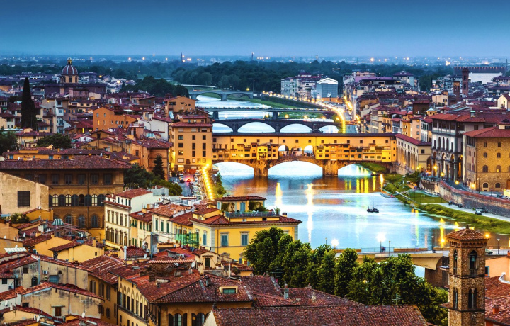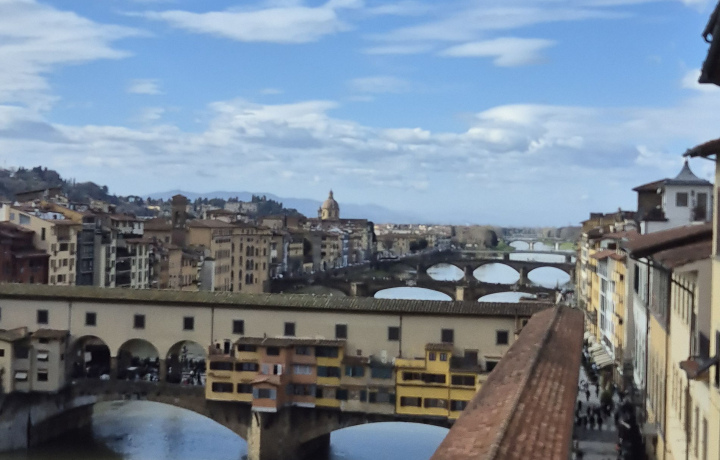 Мост Понте Веккьо, что значит «Старый мост», возведен в 1345 году на месте древнего мостового перехода, снесённого паводком на реке Арно. Трёхпролетный пешеходный мост поддерживают широкие каменные арки, опирающиеся на два мощных пилона. От берега до берега мост плотно застроен двухэтажными домами ремесленников, несколько домишек расположились на платформах, нависающих над водой.