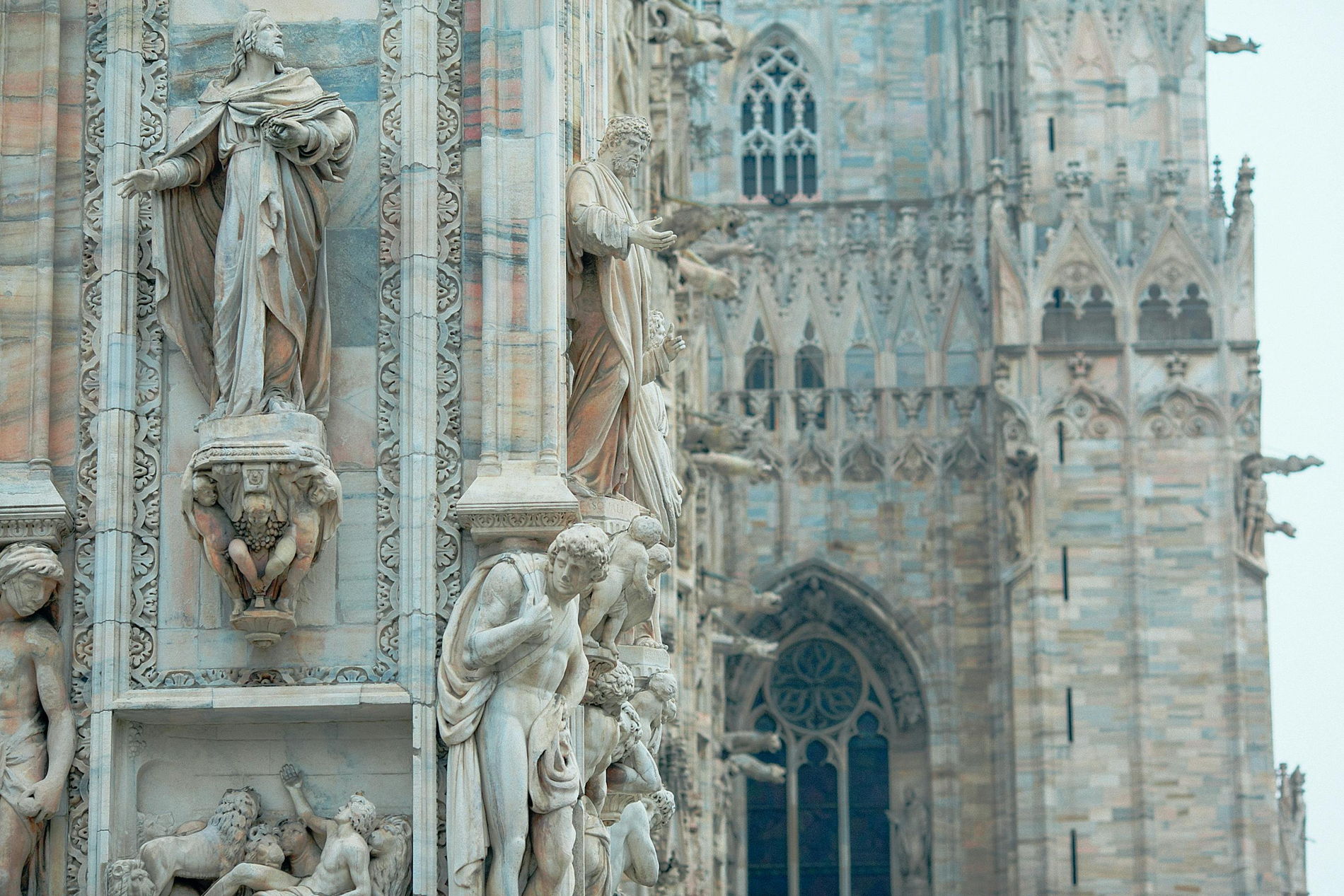 Затем медленно обойдём часть фасада, чтобы увидеть уникальные детали, которые незаметны издалека: статуи святых, фантастических существ и даже неожиданные современные образы, скрытые среди скульптур.