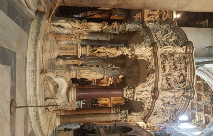 Баптистерий Сан-Джованни городская крестильня с особой акустикой хранит предметы особой гордости: рассмотрим крестильную купель с изящными мраморными резными панелями, инкрустированные мраморные полы выложенные уникальным геометрическим узором из разноцветных камней, шестиугольный мраморный Амвон, с которого читали Ева́нгелие, скульптора Никколо Пизано, барильефы напоминающие резьбу саркофагов мемориального кладбища. Если мы будем внутри, когда солнце в зените, а сквозь окно пробьётся солнечный луч на один из барельефов, возможно, будем свидетелями интересное явления.