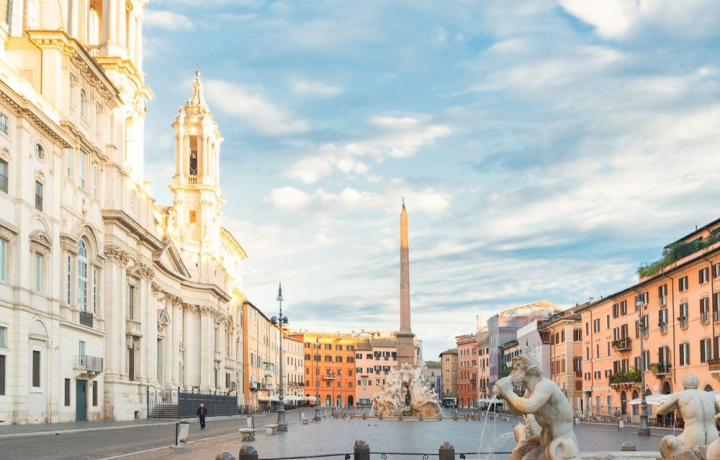 Площадь Навона с тремя великолепными фонтанами, включая знаменитый Фонтан Четырёх Рек, и постоянными выступлениями уличных артистов.