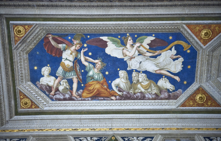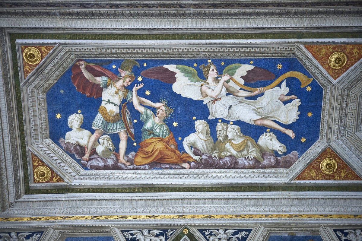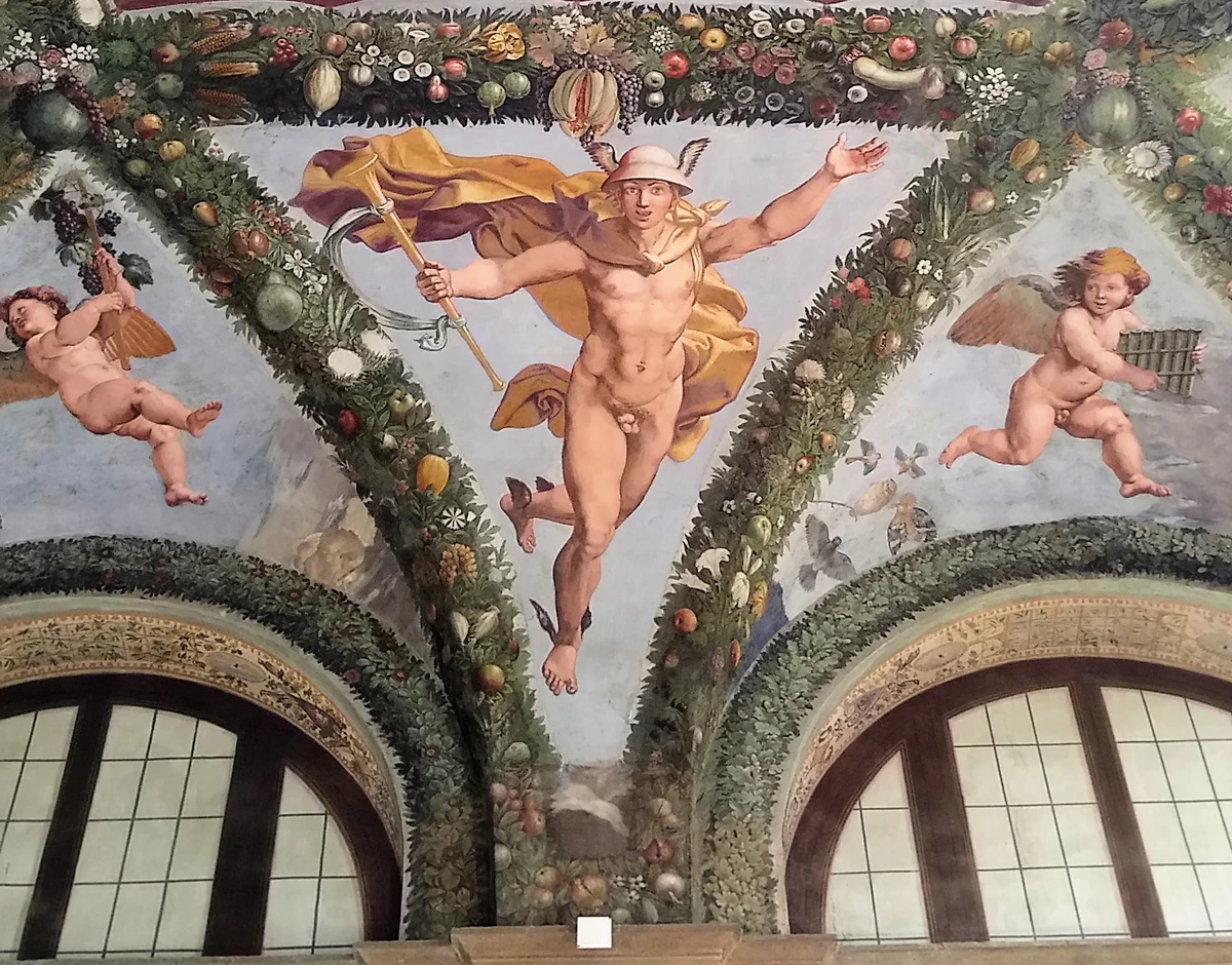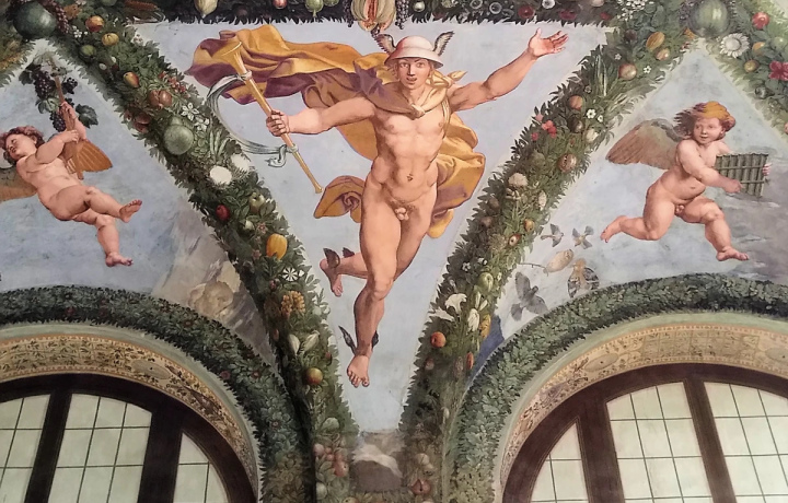 Торжество красок жизни подарил вилле Рафаэль, который работал здесь в двух залах — расписал потолок с историей Амура и Психеи в виде занимательного комикса и изобразил триумф Галатеи. В первом зале вы будто окажетесь в своеобразной беседке, как и задумывал автор. Осмотрите росписи лиственных гирлянд с цветами, ягодами и даже овощами. А с панорамных окон взглянете на чудесный сад. Мы подробно остановимся на изображениях моментов из истории Амура и его земной любви Психеи: от их встречи до пышной свадьбы на Олимпе. А затем разберем тонкости другой жемчужины галереи, я расскажу о вдохновившем мастера прообразе, визите Микеланджело и его «автографе» на стене.