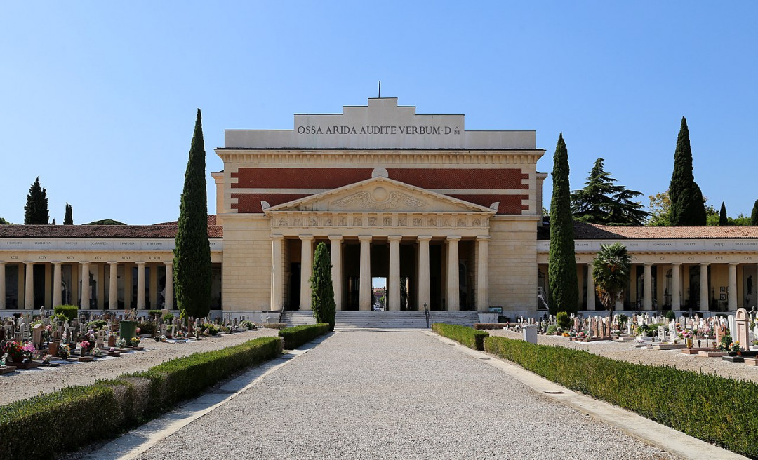 В 1804 году Наполеон издал указ, запрещающий хоронить усопших в городской черте. Веронское монументальное кладбище было построено по проекту местного архитектора Джузеппе Барбьери. Величественный фасад главного входа он выполнил в неоклассическом стиле с отсылкой к греко-римскому пантеону. Кладбище квадратной формы окружают галереи с колоннадами, в которых построены капеллы. Над многими могилами возвышаются скульптуры — ангелы, символические, жанровые и семейные композиции. Памятники выполнены в разных стилях — от античной классики до арт-нуво. Некоторые захоронения отмечены только крестами или простыми надгробными плитами.