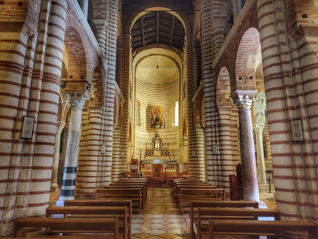 Внутреннее пространство базилики разделено на три нефа двумя рядами колонн из красного мрамора. Стены украшены великолепными фресками. До сегодняшних дней сохранился мраморный мозаичный пол, которому почти семь веков. Таким же мрамором отделана входная арка. У помещения отличная акустика, поэтому жители и гости Вероны специально приходят сюда послушать орган.
