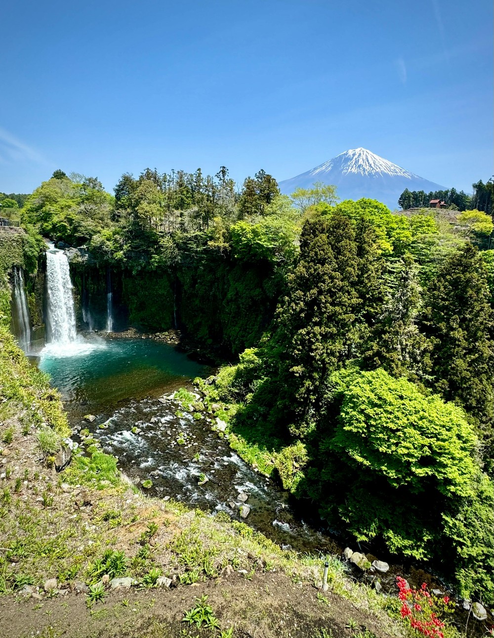 Красные ворота тории на склоне горы, принадлежащие храму Кавагути Асама. Возведены в 2019 году как место поклонения горе Фудзи. Весной окружены цветущей сакурой.