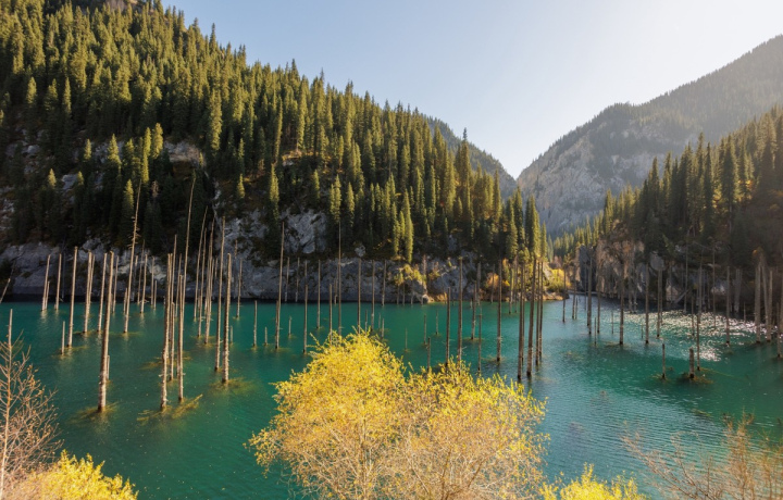Озеро Кольсай. Вы пройдёте по его берегам и полюбуетесь изумительными синими водами. Удивитесь тому, как деревья смогли вырасти прямо из глубин озера, и почувствуете единение с природой.