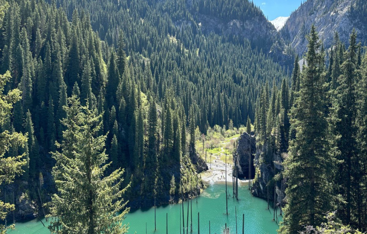 Озеро Каинды — природный феномен: прозрачную воду пронзают стволы вековых елей, которые создают атмосферу загадочности. Топовая локация для фото!