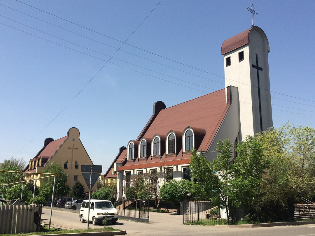 Кафедральный римско-католический собор Пресвятой Троицы построен в 1998 году. Небольшой храм возвели для сильно поредевший в годы Перестройки немецкой католической общины Алма-Аты. Храм стал одним из духовных центров города, где собираются прихожане, проходят культурные события и мероприятия. Внутри небольшого молельного зала находится копия креста Святого Дамиана. За храмом в импровизированном гроте установлена статуя Девы Марии. Рядом на табличке выбит текст католической молитвы «Аве Мария» на трёх языках — латинском, казахском и русском.